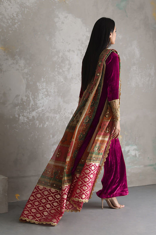 VL2069 Sidra Mumtaz 3PC Valvet Front Full Embroidered Back Bazo Embroidered Bember Dupatta -